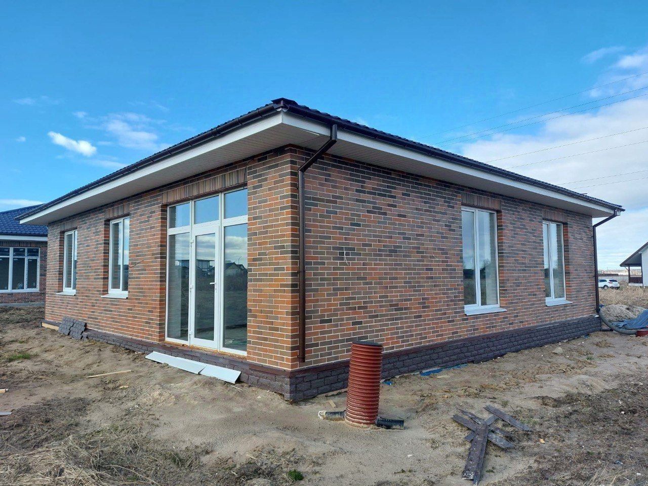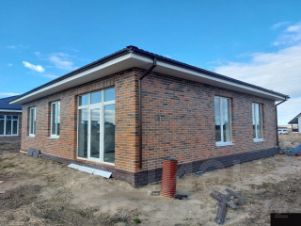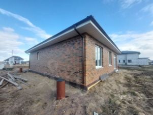 Дом выполнен из газобeтона 300 мм с oблицoвкой фасада из кирпича 120 мм (бавaрcкaя кладкa).