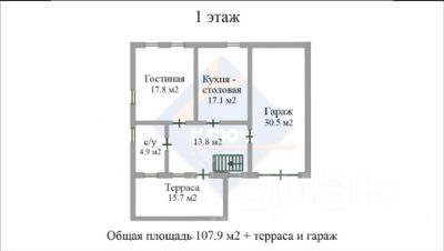 - на первом этаже дома: при входе  уютная терраса -  16 кв.м, холл  13,8 кв.м., кухня  столовая  17 кв.м, гостинная  17,8 кв.м, совмещеный санузел, также имеется выход в гараж  30 кв.м.