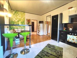- пол везде ламинат, зона кухни выделена плиткой, натяжные потолки, на стенах обои, везде стеклопакеты;