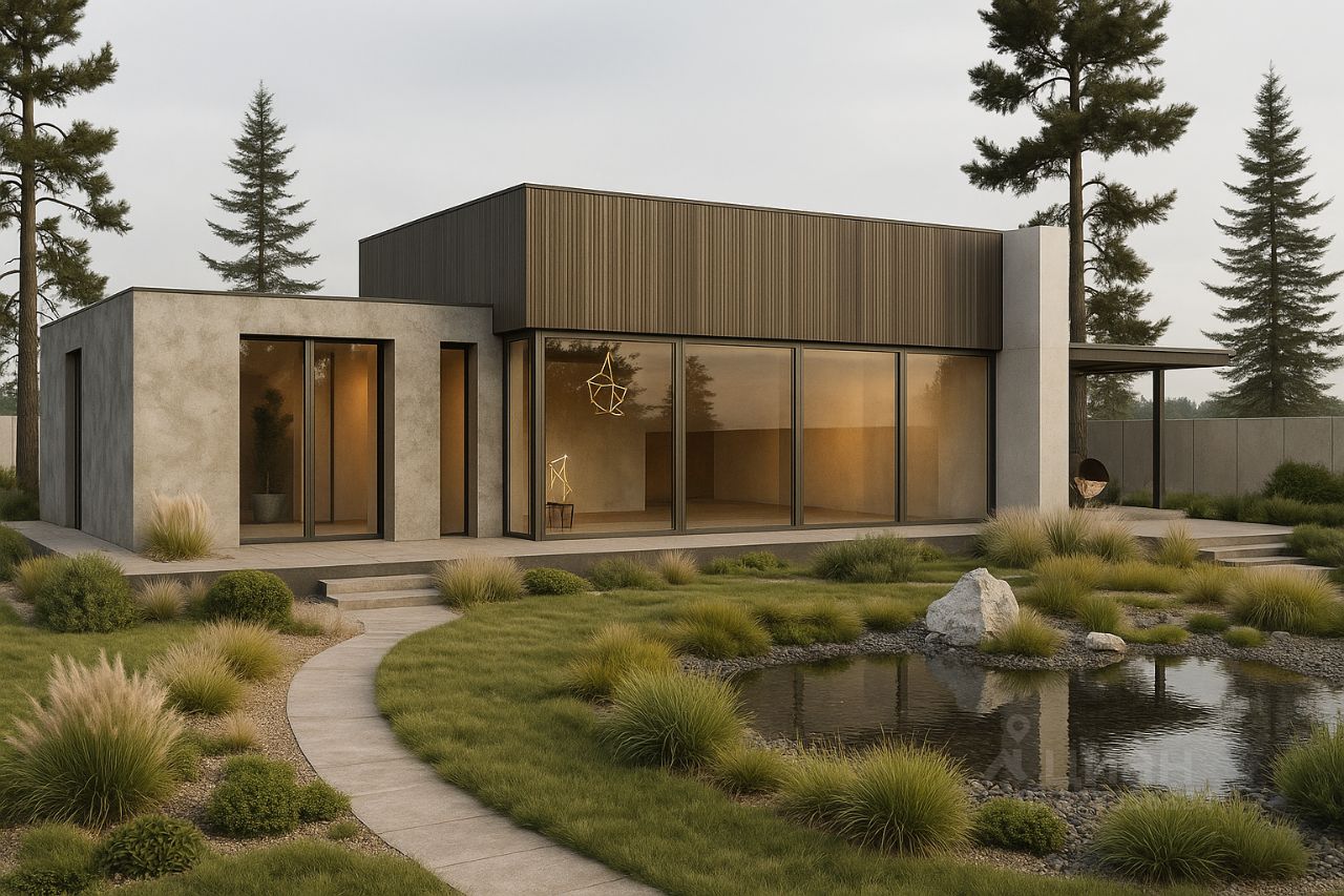 На изображениях представлен проект финального архитектурного решения дома, выполненный в лаконичном современном стиле с панорамным остеклением и продуманной планировкой.