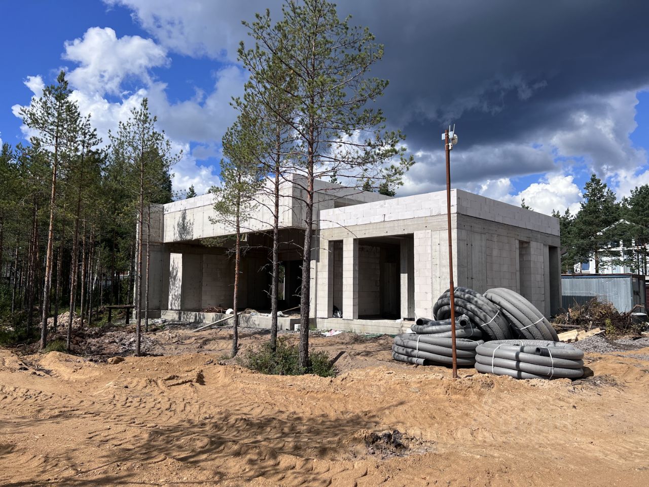 Начато строительство современного одноэтажного дома — работы доведены до стадии холодного контура (фундамент, монолитный каркас, монолитное перекрытие, заполнение внешних стен газобетоном ).