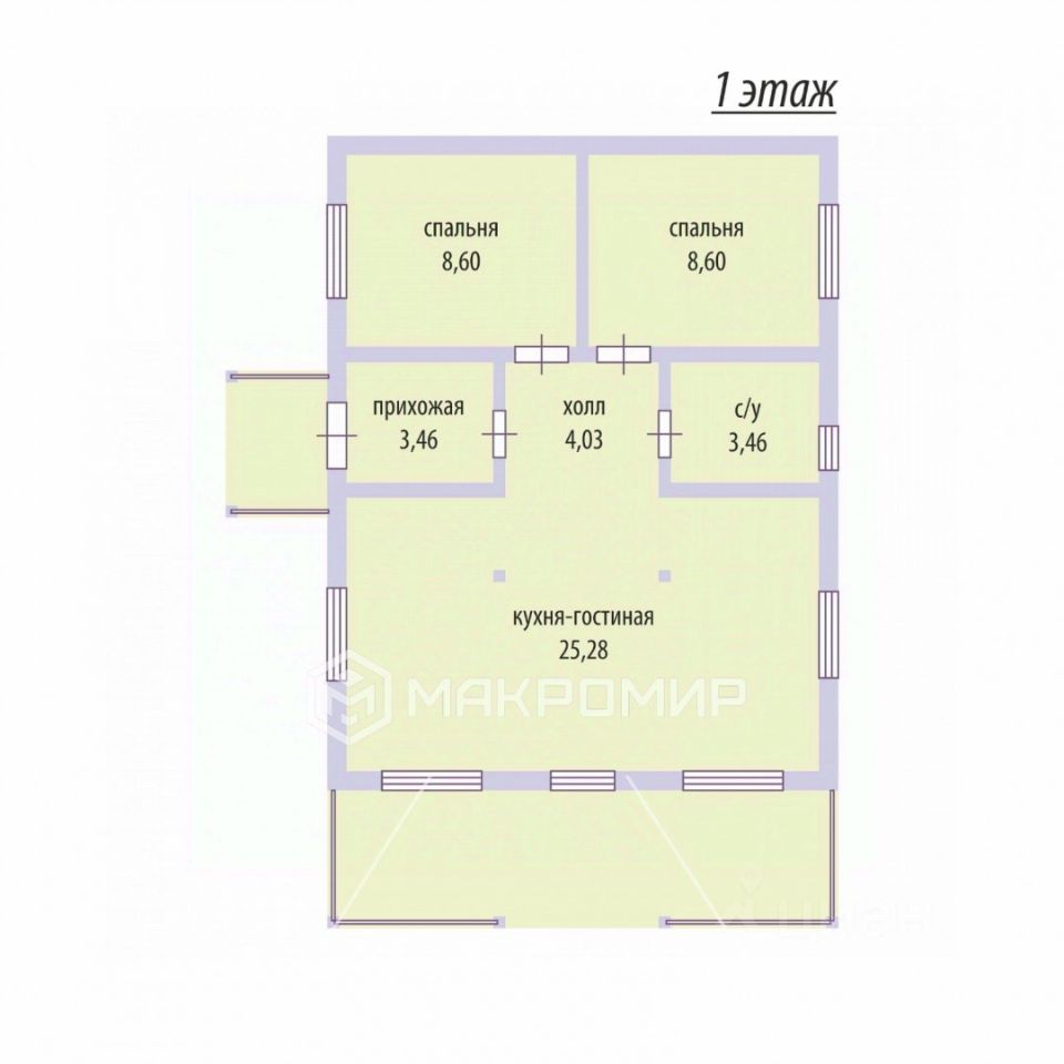 В доме кухня- гостиная 25м2 , две спальни ( 9+9 м2), прихожая , санузел, крыльцо и широкая крытая терраса. Также сделан мансардный лофт- этаж 10 м2 с лестницей и небольшими помещениями- кладовками