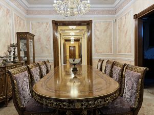 Нижний этаж жилой части дома — парадный, его интерьеры выполнены в классическом дворцовом стиле. Здесь расположились основная кухня, столовая, гостиная, кабинет, библиотека,а также комната для гостей. Мебель известного итальянского бренда Artе Aredo изготовлена специально для этого особняка. Фасады консолей и шкафчиков в гостиной — из корня акации, с подбором натуральной текстуры материала в тонкий симметричный узор.