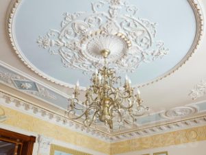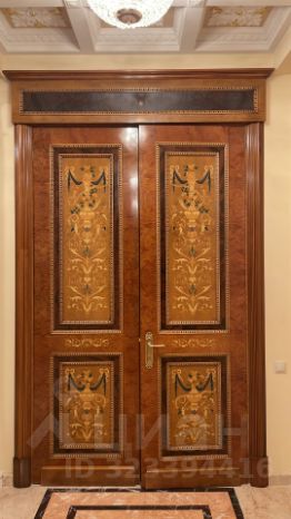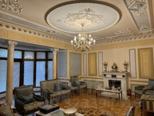 В парадную часть дома ведут двери, инкрустированые тонким узором из ценных и пород дерева. Перед вами открывается великолепный парадный холл с торжественной мраморной лестницей.