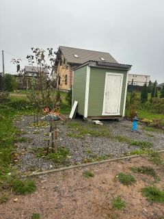 Установлена бытовка с верандой, в которой можно жить и прекрасно проводить первое время на участке, она стоит на блоках. Так же ну участке  присутствует сарай 2 на 2. Весь инвентарь для участка, и наполненность бытовки - оставят в подарок.