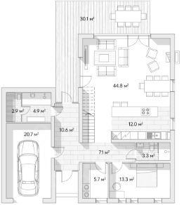 Повышенный комфорт обеспечивают мастер-спальня на втором этаже, дополненная собственной рабочей зоной или бьюти-корнером, а также спальня на первом этаже для гостей или старших родителей. На территории проекта вы найдете свой лесной парк, а в окрестностях — магазины и рестораны, спортивные и рекреационные объекты, образовательные и медицинские учреждения.