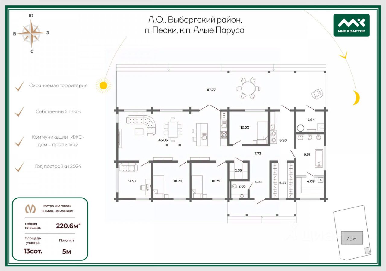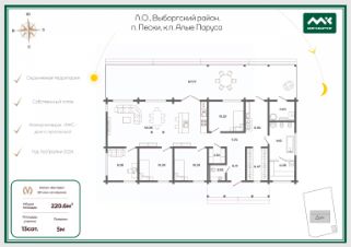 Общая площадь дома: 220,6 м² (жилая 135,29 м², терраса 77,34 м²).