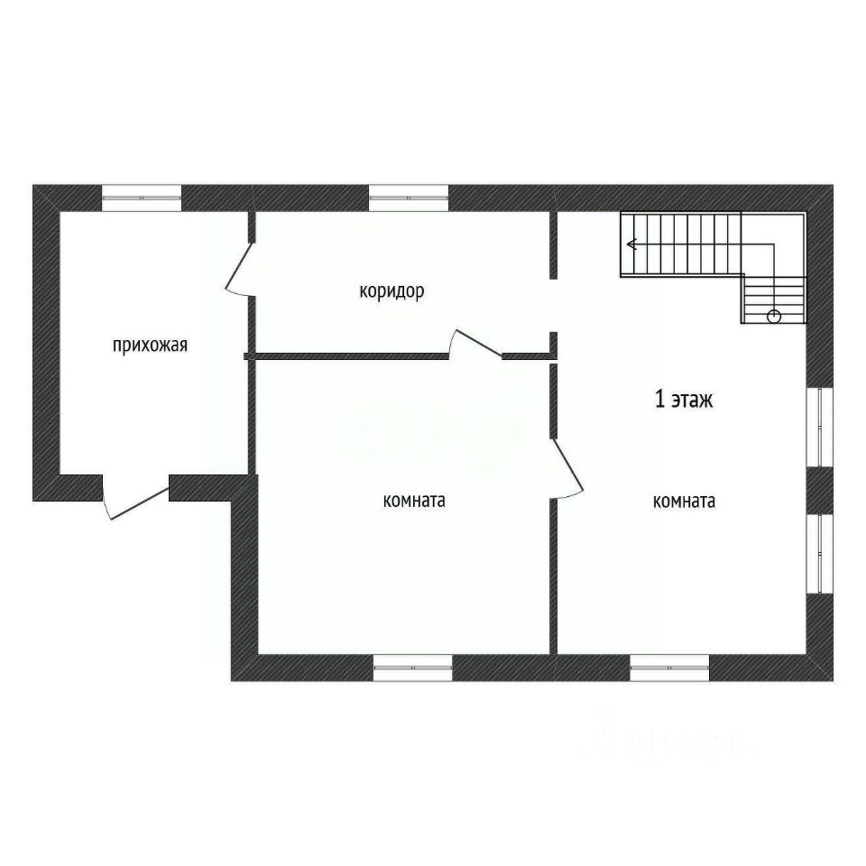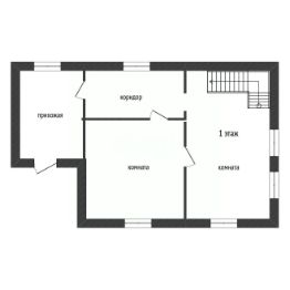 В доме три просторные комнаты: две на первом этаже и одна — на втором.