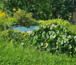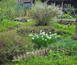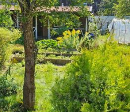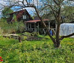 На участке есть теплица, плодовые кусты, яблони и цветы.