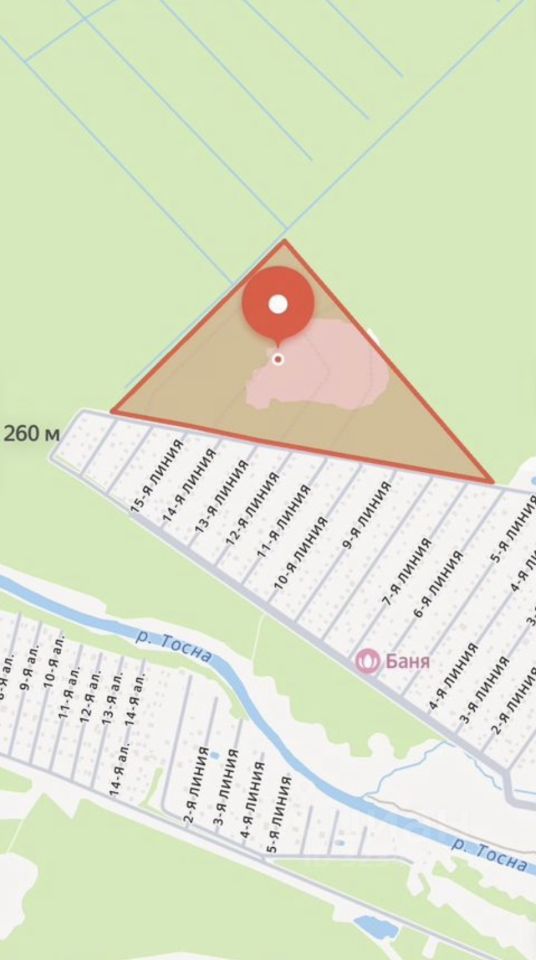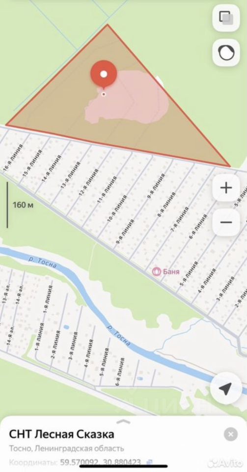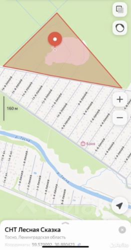 Земельный участок продается в СНТ Лесная сказка площадью 11 соток в границах г. Тосно, кадастровый номер: 47:26:0603002, до центра города Тосно 5 км.  На машине 5 минут. 40 км. до Санкт-Петербурга. 19 км. до карьеров в пос. Шапки, Тосненского района ЛО. Участок ровный.  Хорошая транспортная доступность: в пешей доступности ж/д станция Зареченская и автобусная остановка. Вокруг лес (грибы, ягоды). Недалеко речка с оборудованным пляжем.На данный момент проведены работы по оканавливанию участков. Далее по плану подсыпка дорог.