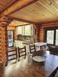 - Первый этаж: гостиная с кухней и финским камином/печью, обогревающим оба этажа;