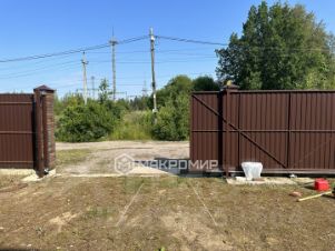 + огорожен забором из профлиста на бетонном фундаменте с каменными столбами, проведена подсветка столбов по фасаду, откатные автоматические ворота