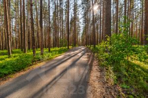 К поселку ведет идеальная асфальтированная дорога через живописный сосновый лес.