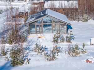 Дом выполнен по комбинированной технологии строительства: в основе панорамного фасада - деревянный фахверк из клееного бруса; основная часть дома сделана из газобетонных блоков.
