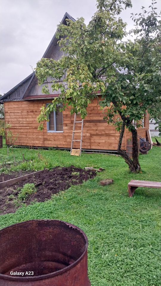 Электпичество завели 15 квт, в доме заменёны лаги и пол, заменен по кругу венец, стены обшиты вагонка, дом поднят на сваи, заменена крыша на металочерепицу, есть колодец, есть документы на дом, и участок отмежован, в доме нет плесени, посадили 6 молодых яблонь и грушу, сад не трогали хорошие урожаи яблок через год собираем, пар в бане хороший.