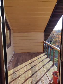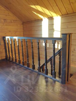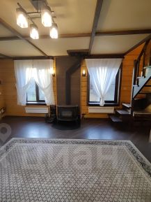 Стены изнутри отделаны имитацией бруса, окрашены. Напольное покрытие ламинат, подоконники деревянные, лестница на 2й этаж сделана по индивидуальному проекту из массива сосны.