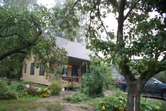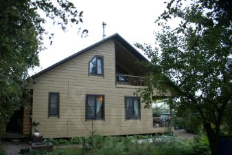 Стены снаружи и изнутри обшиты имитацией бруса, утеплитель 200 мм., общая толщина стен 250 мм. Снаружи дом окрашен.