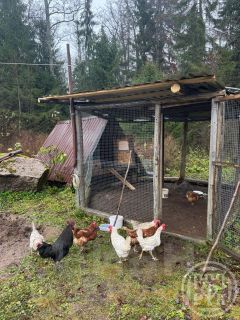 На территории находится гараж построенный из пеноблоков, в связи с этим хорошо держит тепло и отапливается печью на дровах. Вода подаётся в дом из колодца который поставлен рядом с финским колодцем где чистейшая питьевая вода. Сам участок находится на возвышенности, так же есть много ягодных кустов теплица, грядки и небольшой курятник. К участку примыкает лесо полоса через которую идет тропинка к речке метров 50. Замечательное место где можно проживать постоянно.