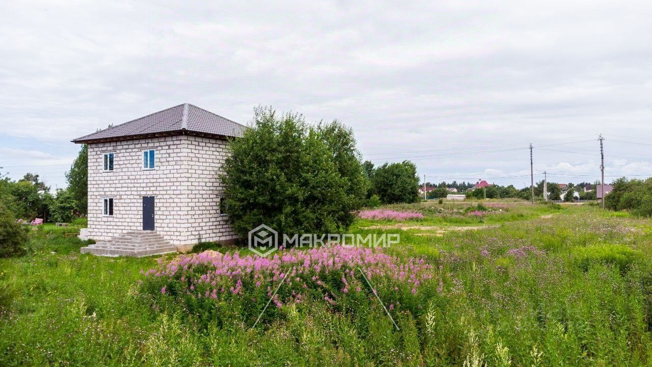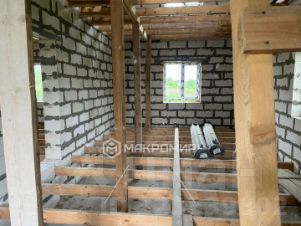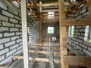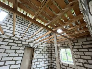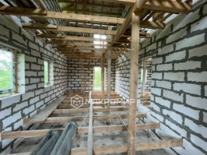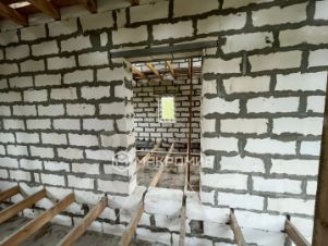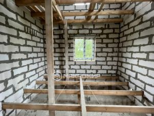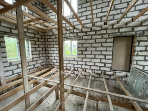 Дом построен из газобетона, ленточный фундамент, установлены двери и окна.