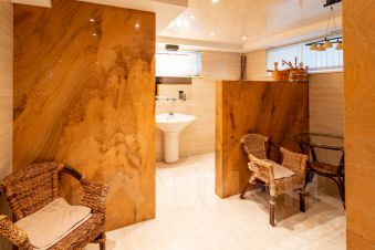 SPA-зона представлена объемным бассейном с противотоком, каскадным водопадом, подсветками, с выходом на открытую террасу, на которой в теплое время располагают лежаки для отдыха и загара, в доме имеется сауна и душевые.