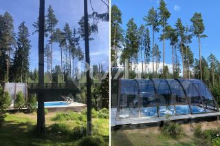 Участок 23 сотки. На участке располагается подогреваемый бассейн со сдвигающимся куполом производства Германии. Таким образом бассейн может быть закрыт или полностью открыт в теплую погоду. В бассейне установлена система противотока, позволяющая провести полноценную тренировку по плаванию и также подводный гидромассаж. Бассейн с подогревом от газового котла и системой подсветки.