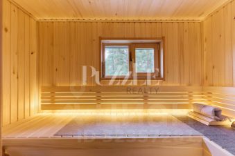 Под одной крышей располагаются основной дом и гостевой домик с сауной.