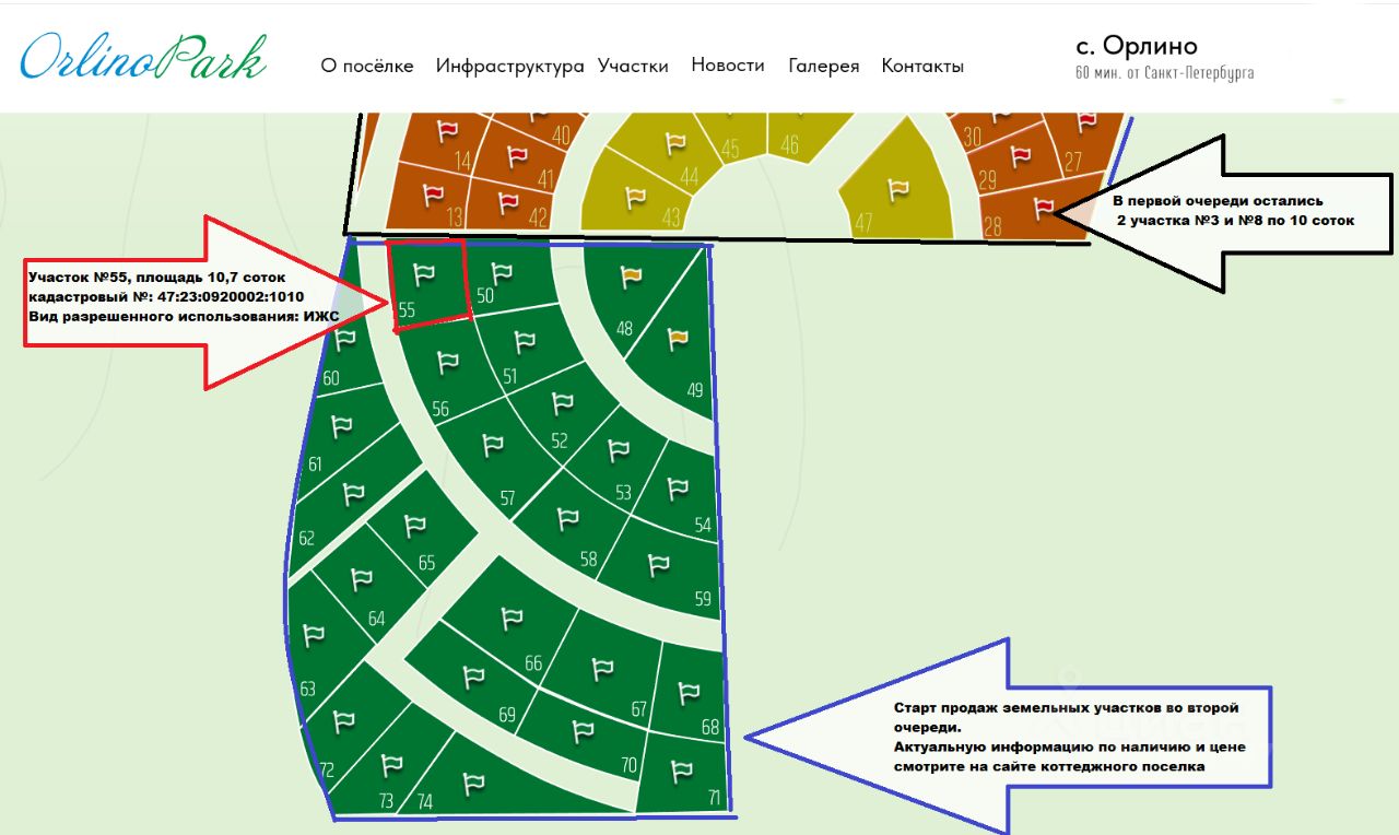 Продается замечательный земельный участок ИЖС в новом, современном коттеджном поселке "Orlino Park" комфорт класса. Участок в окружении густого смешанного леса (грибы,ягоды), в пешей доступности (700 м) находится живописное "Орлинское озеро" с пляжами, "Серебряный" родник, а также Храм Преображения Господня. Идеальное место для загородного отдыха!
