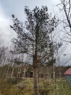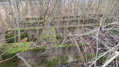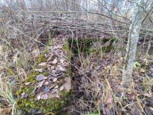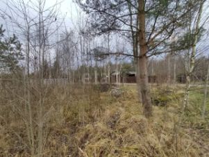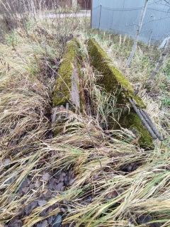 На участке установлены бетонные блоки для строительства бани или иных построек, есть небольшая растительность, а также прекрасные сосны.