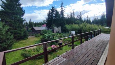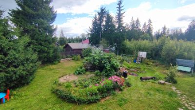 Участок 10 соток, зонирован под посадки, плодовые деревья, ягоды. Растут: ель, сосна, лесная черника, ежевика, малина, земляника, клубника, яблони, вишня, груша. По центру находится альпийская горка.