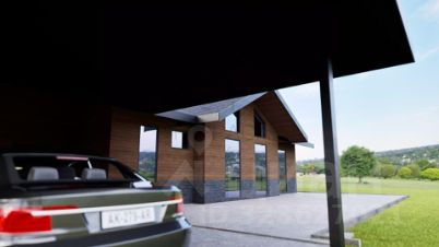 Из гостиной открывается панорамный вид, который меняется вместе с сезонами, наполняя интерьер природным светом и особенной атмосферой. Просторная крытая терраса расширяет границы дома - здесь можно устроить обед на свежем воздухе, зону отдыха или уединённый уголок.