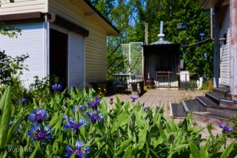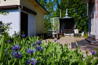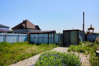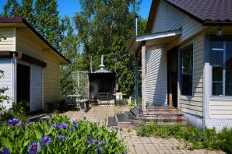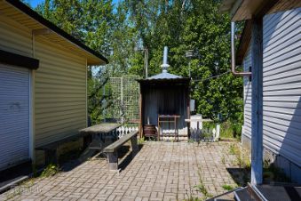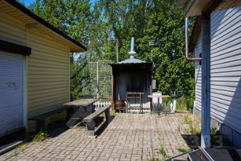 На территории также находится баня с душем и гостевой комнатой, дополненной верандой. Участок оформлен с заботой: вымощенные брусчаткой дорожки, оборудованная мангальная зона и обеденная зона для летних посиделок создают атмосферу уюта и комфорта.