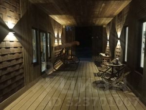Дом состоит из двух блоков общей площадью 108 кв. м. Основной блок занимает 81 кв. м, а второй — 27 кв. м. Между ними расположена крытая терраса площадью 40 кв. м, а общая площадь всех террас составляет 110 кв. м.