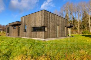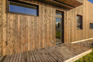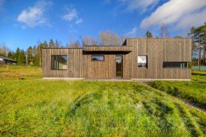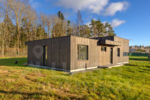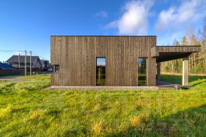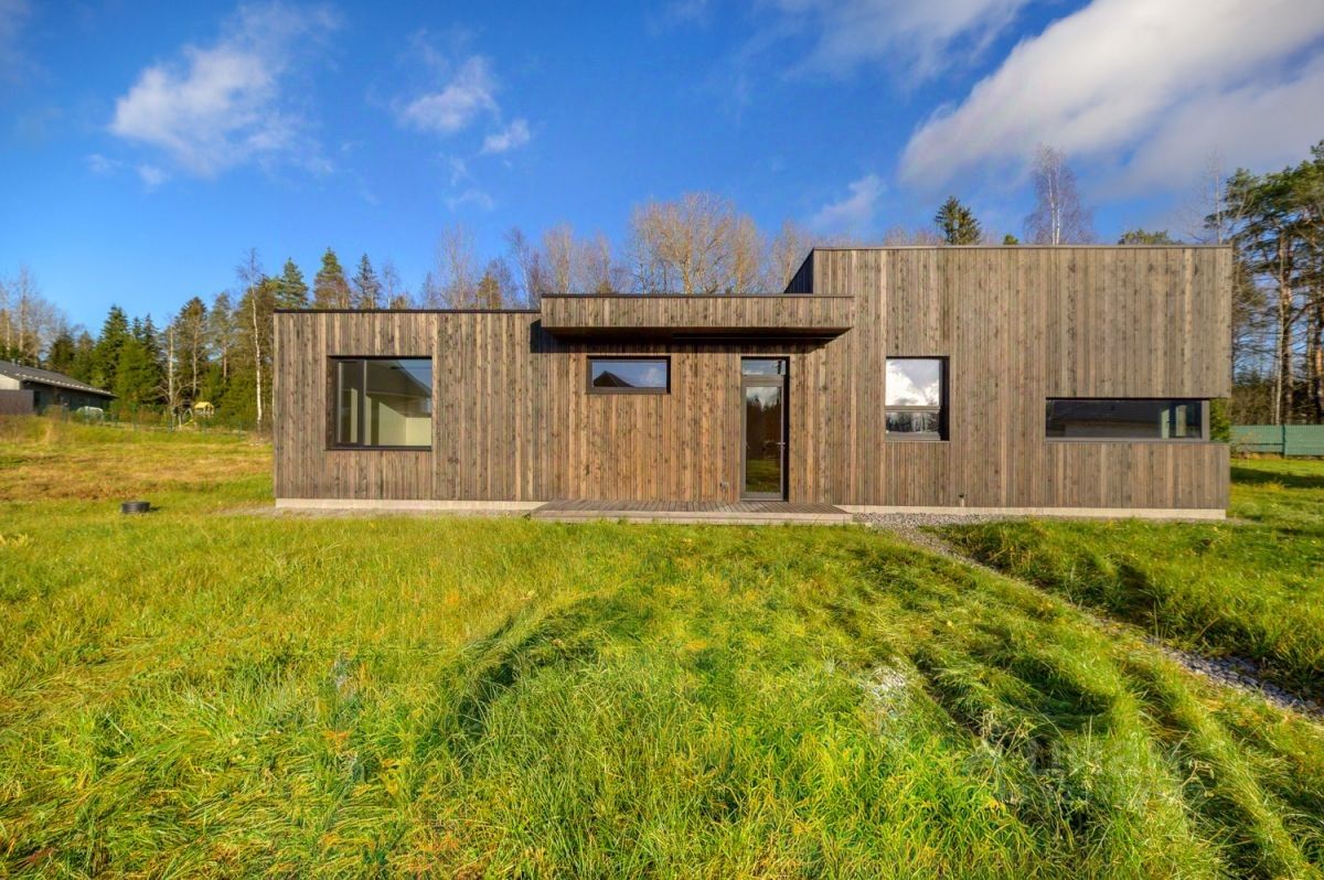 Дом построен на утеплённой шведской плите, стены из газобетона толщиной 400 мм, фасад отделан сосной, покрытой лазурью Акватекс Плюс. Крыша утеплена 300 мм минваты, покрыта ПВХ-мембраной Технониколь, с разуклонкой и скрытой водосточной системой.