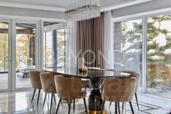 Первый этаж единое пространство, в котором соединены гостиная с камином с отделкой из оникса, кухня и столовая с выходом на террасу. Кухня с итальянскими комплектующими и техникой Kuppersbusch. Зонирование делает особенно красивым сверкающие люстры и отделка камнем.