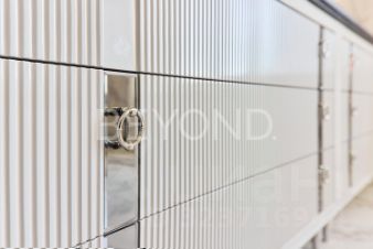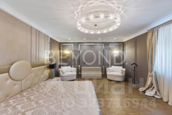 Мастер-спальня с огромной кроватью от Fendi, брутальные лампы и мебель от Eichholtz. Стены спальни обшиты тактильно приятным текстилем. Мастер-гардеробная комната изыскана, функциональна и вместительна.