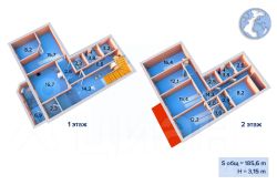 Общая площадь — 183 м², распределена на два полноценных уровня. Всего шесть изолированных комнат, кухня, санузлы на каждом уровне. Высота потолков — 3,15 м. Все окна выходят во двор, что обеспечивает тишину и уединенность.