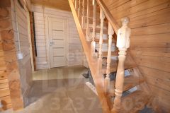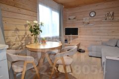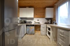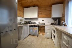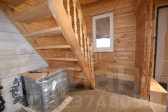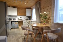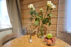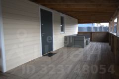 Здание построено из бруса 15 см с фасадной отделкой сайдингом, что обеспечивает дополнительную защиту и минимальные затраты на обслуживание. К дому пристроена большая закрытая веранда, которую можно использовать как зону отдыха в любое время года, а также хозяйственный блок с котлом для дровяного отопления. Инженерное оснащение включает два вида отопления — электрическое и дровяное, систему очистки воды с подачей питьевой воды непосредственно из крана, а также бесперебойное горячее водоснабжение благодаря бойлеру на 150 литров