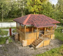 На участке организованы 3 парковочных места для автомобилей, по периметру дома сделана отмостка камнем, есть беседка, зона барбекю, фруктовый сад и газон.