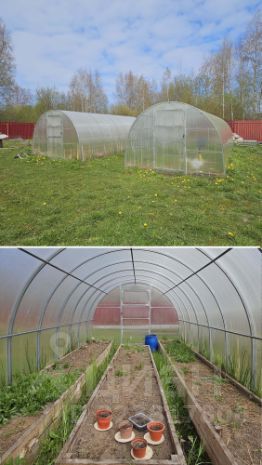Участок ровный, правильной формы, огорожен забором (штакетник), на участке два больших парника, хоз постройка.
