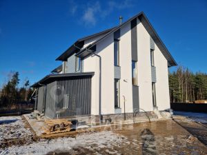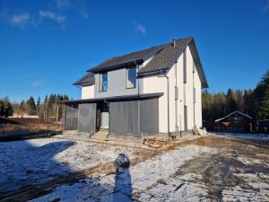 - Дом построен из газоблока ЛСР с утеплением фасада 100 мм., отделан декоративной штукатуркой и планкеном;