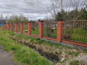 По периметру участков установлен забор, с автоматическими воротами, фронтальная часть забора винтовые сваи, монолитные столбы с кирпичными вставками.