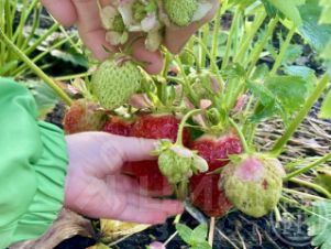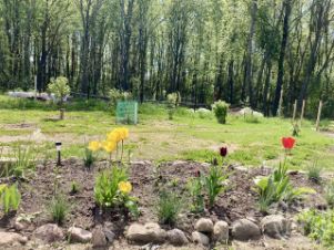 Плодовые кустарники (малина и смородина), плодовые деревья (яблоня и груша), грядки, огороженные заборчиком, клубника, туи.