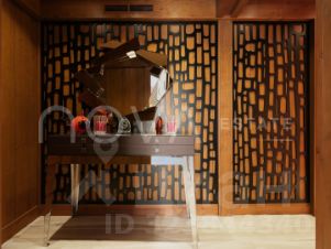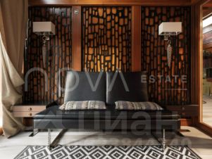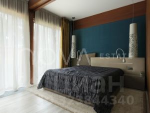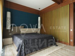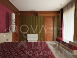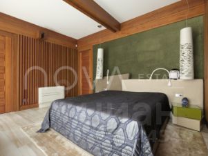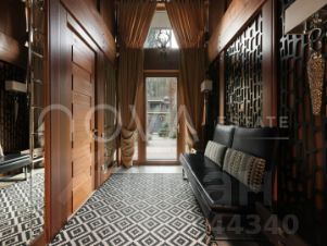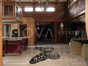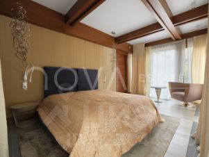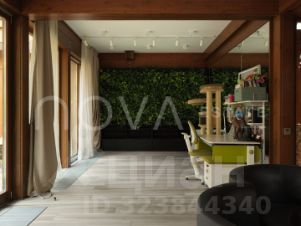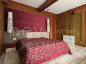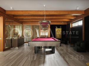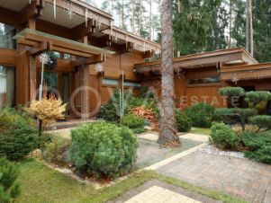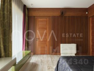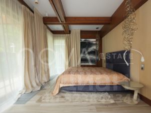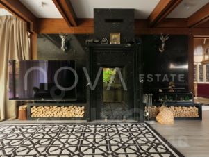 Внутреннее пространство наполнено теплом натуральных материалов и тщательно подобранными элементами обстановки. В столовой — парящая хрустальная люстра Ipe Cavalli, итальянская мебель Longhi и акценты от Rolf Benz. Кухня выполнена из шпона вишни, дополнена встроенной техникой и центральным островом. Зона отдыха ориентирована на внутренний двор: большие панорамные окна, двусторонний камин Boley, мебель Visionnaire, кинотеатр и выход на террасу. Здесь же расположен внутренний сад с фонтаном круглогодичным обогреваемым бассейном.