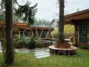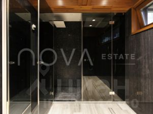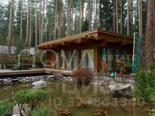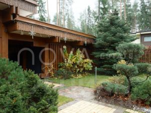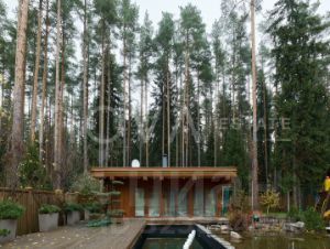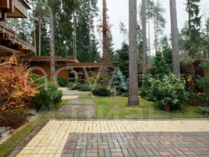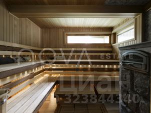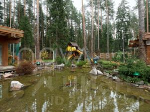 На участке — живой пейзажный сад с редкими декоративными породами, организован автополив, мягкая ландшафтная подсветка, ручей с фильтрацией и естественными камнями. Банный домик с финской печью Tulikivi выполнен из натурального камня, оборудован кухней и меблирован итальянским брендом STRATO.