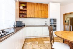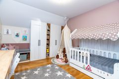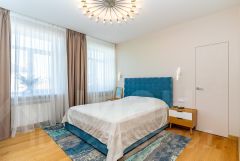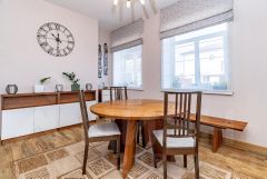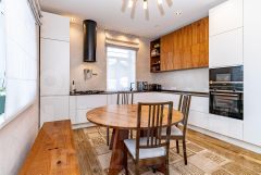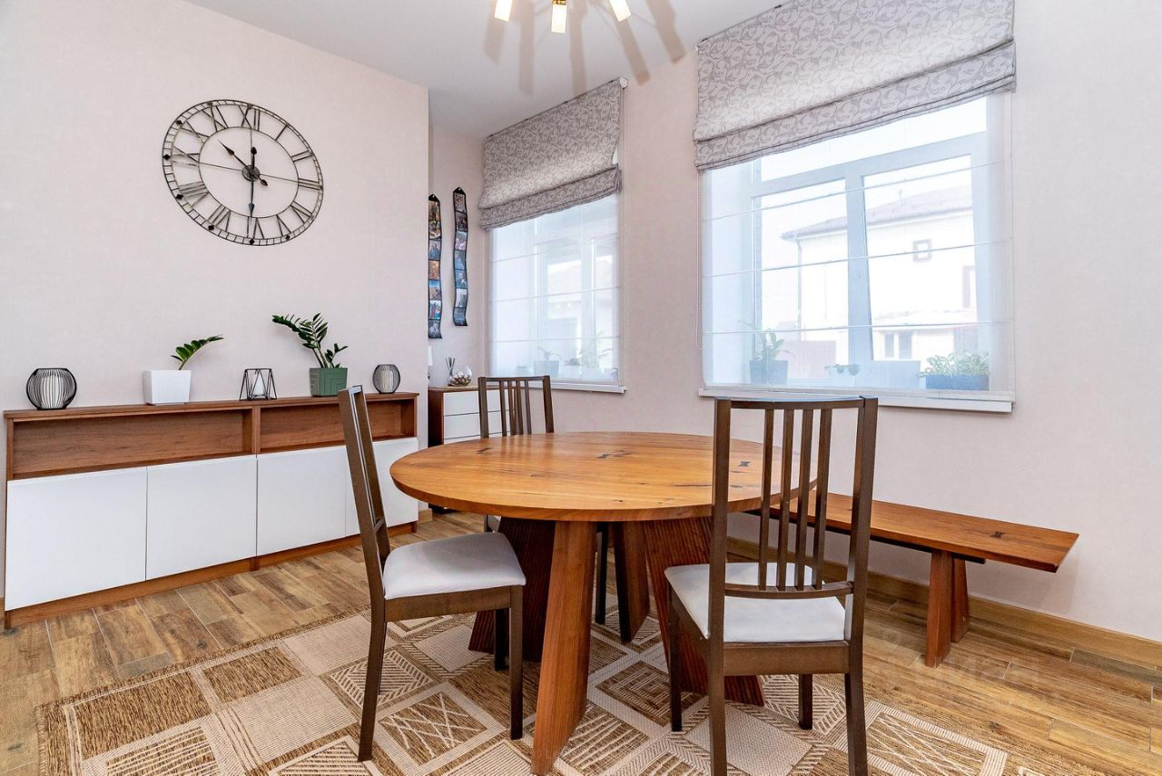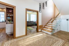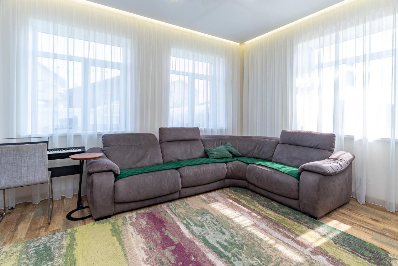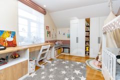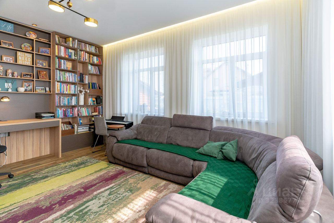 Сделана очень качественная отделка дома : на материалах не экономили . Мебель изготовлена на заказ . Продумано все до мелочей для комфортной жизни дружной семьи: электрические опускающиеся шторы , уголок для чтения , подсветка лестницы с датчиками движения, расположение выключателей и светильников.