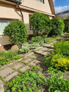 По участку много дорожек и площадок, выложенные тротуарной плиткой и натуральным камнем. Площадки для отдыха с каменной лестницей и бетонной скамьей.