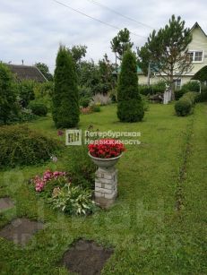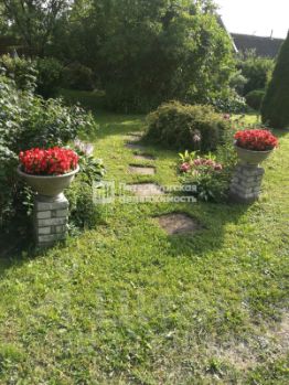 На участке три альпийские горки, несколько клумб облицованы натуральным камнем, вазоны с цветами, ухоженный газон, островки красиво подстриженных кустарников разных пород, разнообразные деревья: яблони, липы, каштаны, дубы и туи.