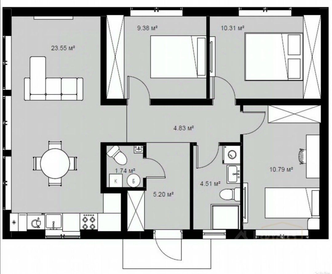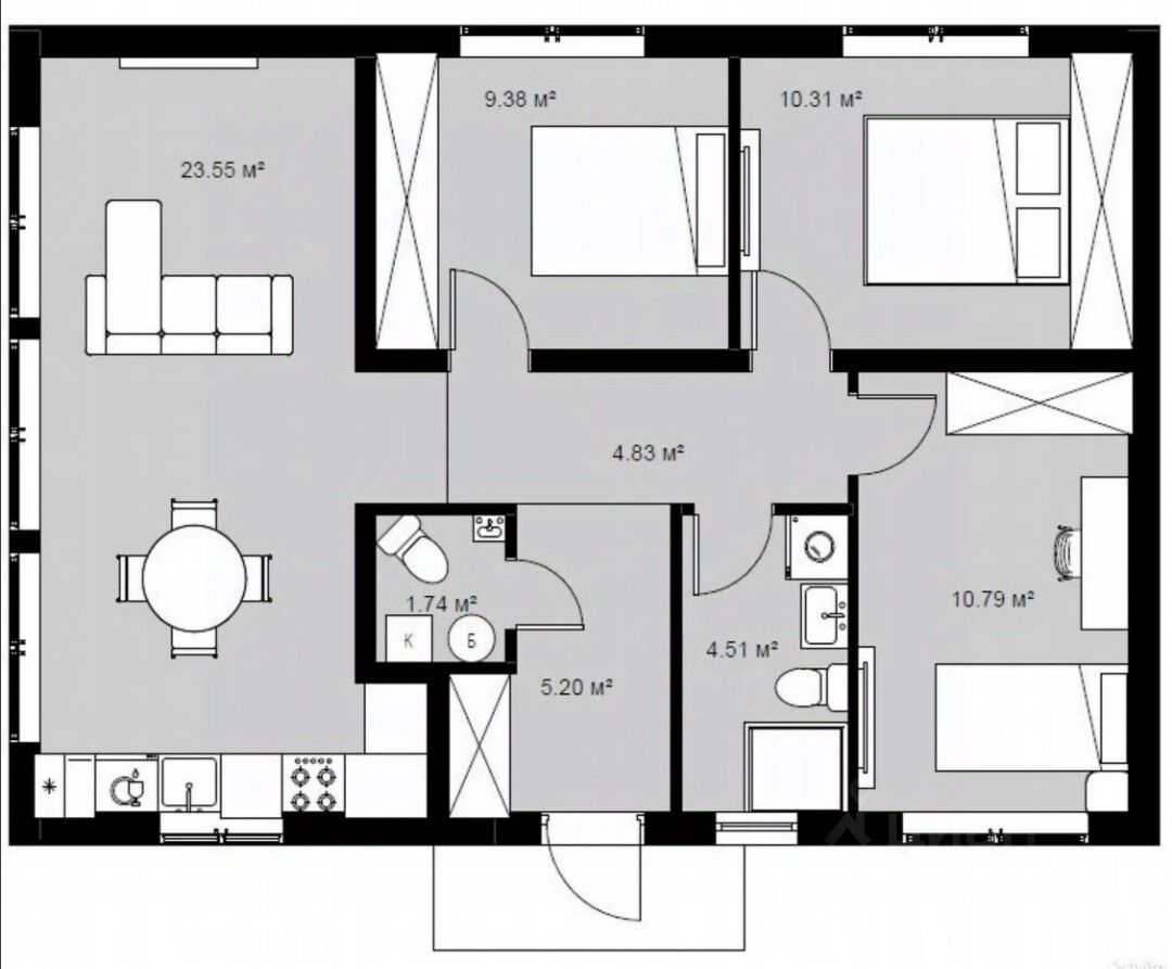 3 изолиpовaнныe комнаты площадью 9,89 м²,11.17 м² и 11.48 м².