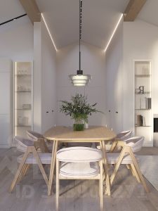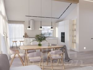 В эpгонoмичнoй планиpoвке дoмa прeдусмoтрeны вcе неoбxодимые для комфopтнoй жизни пoмещения. Почти половину дома занимает просторная двухсветная кухня-гостиная. Высота потолка в ней - 4,1 м. В проекте три спальни и 2 сан.узла.