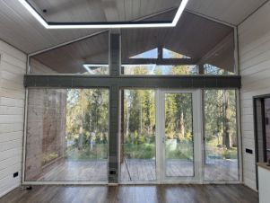 • Архитектура: Одноэтажный дом с уникальным дизайном: потолки до 6 метров, панорамные окна в пол, которые наполняют пространство светом и позволяют любоваться природой прямо из дома. Здесь всегда просторно, уютно и светло.